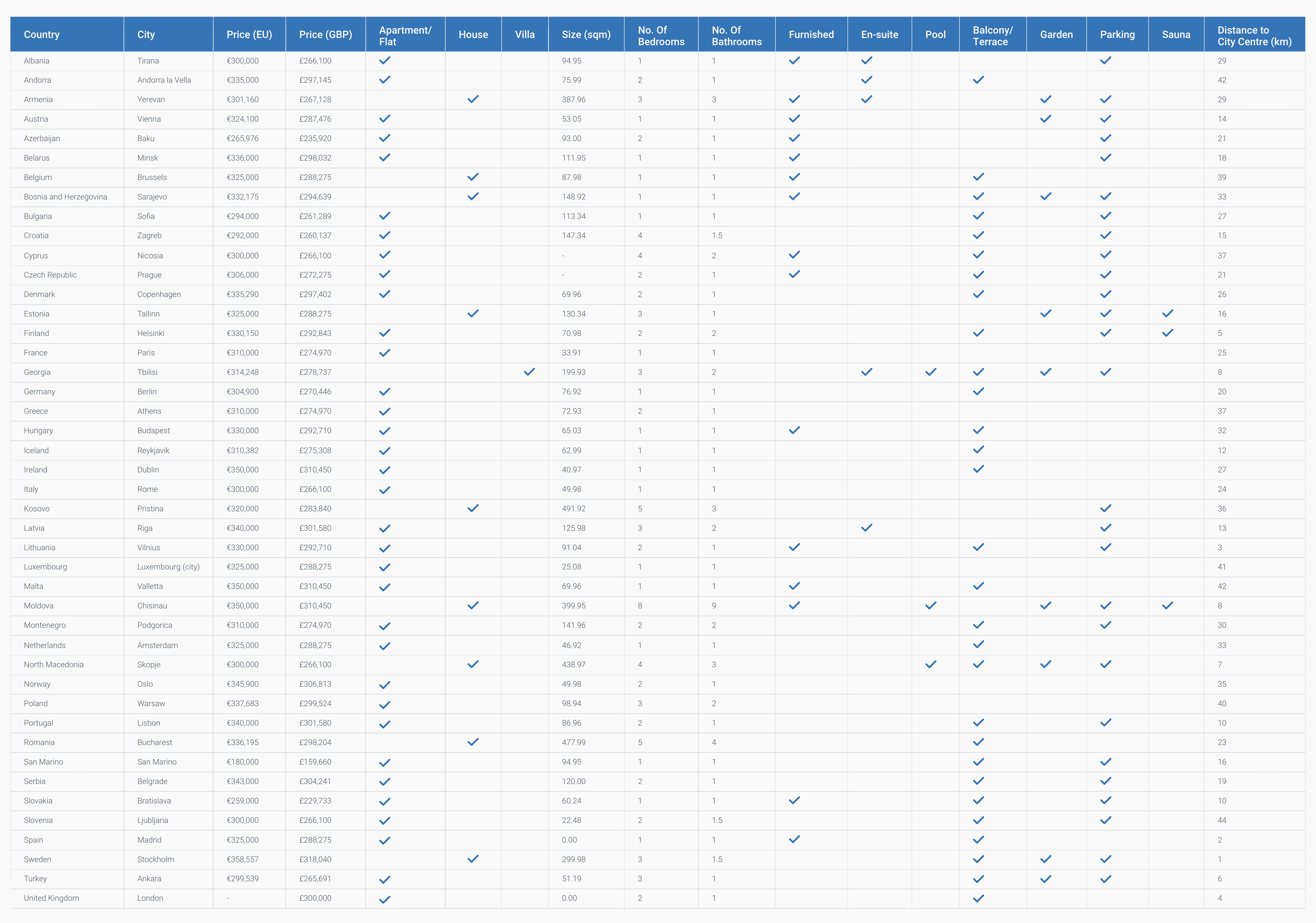 To do this, we used Google to find one of each country’s top domestic property portal, and searched for properties in the capital city within the €300-330k bracket. Then, we arranged the listings by most popular, most viewed, or most relevant, and selected a property at random in the top 5 listings. This acted as a representative/typical example of the kind of properties available in that area within the price €300-330k range.