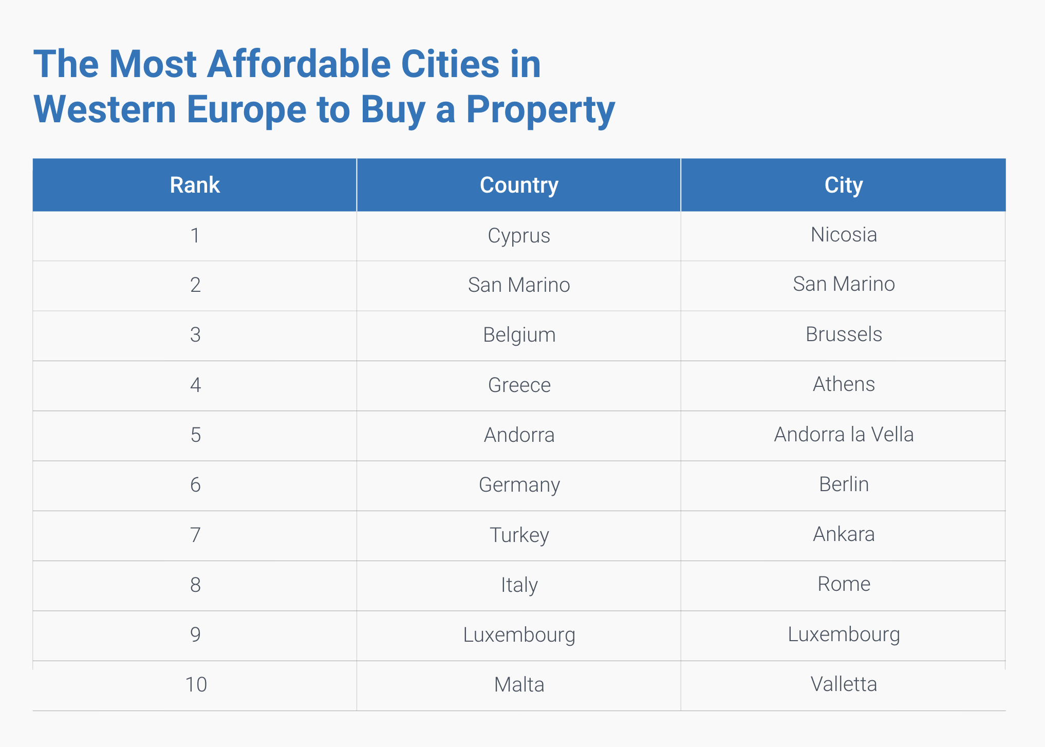 Following Nicosia, San Marino and Brussels on our list of the most affordable housing in Western Europe’s capital cities, we have Athens, Andorra la Vella, Berlin, Ankara, Rome, Luxembourg and Valletta.